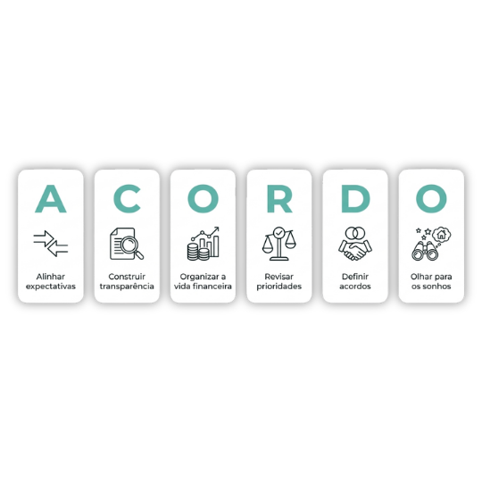 Dentro do ebook, você vai conhecer o método A.C.O.R.D.O, um caminho simples e prático para ajudar casais a conversarem sobre dinheiro com mais clareza, respeito e parceria.
